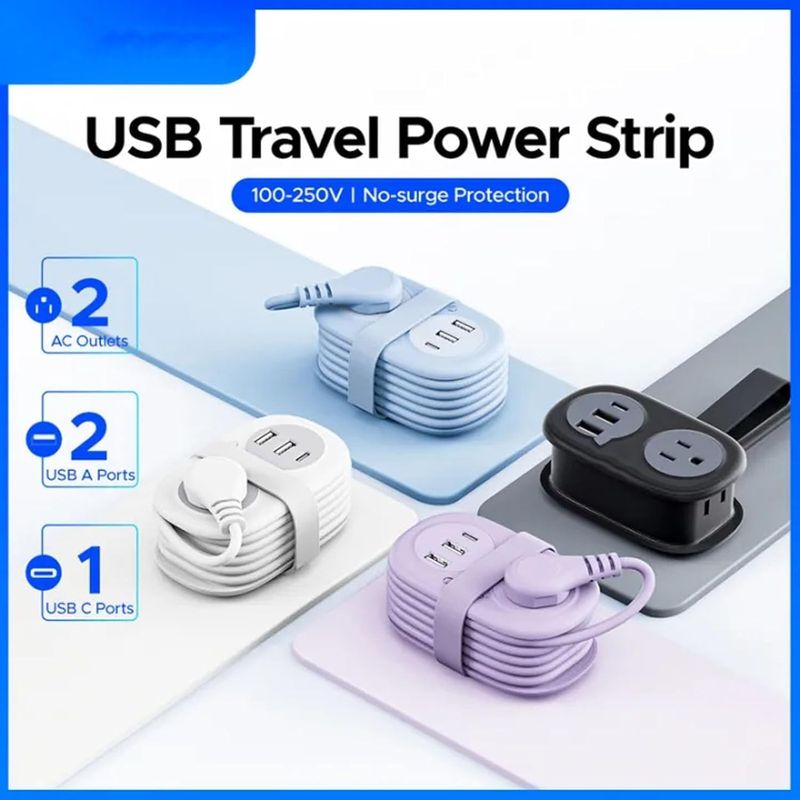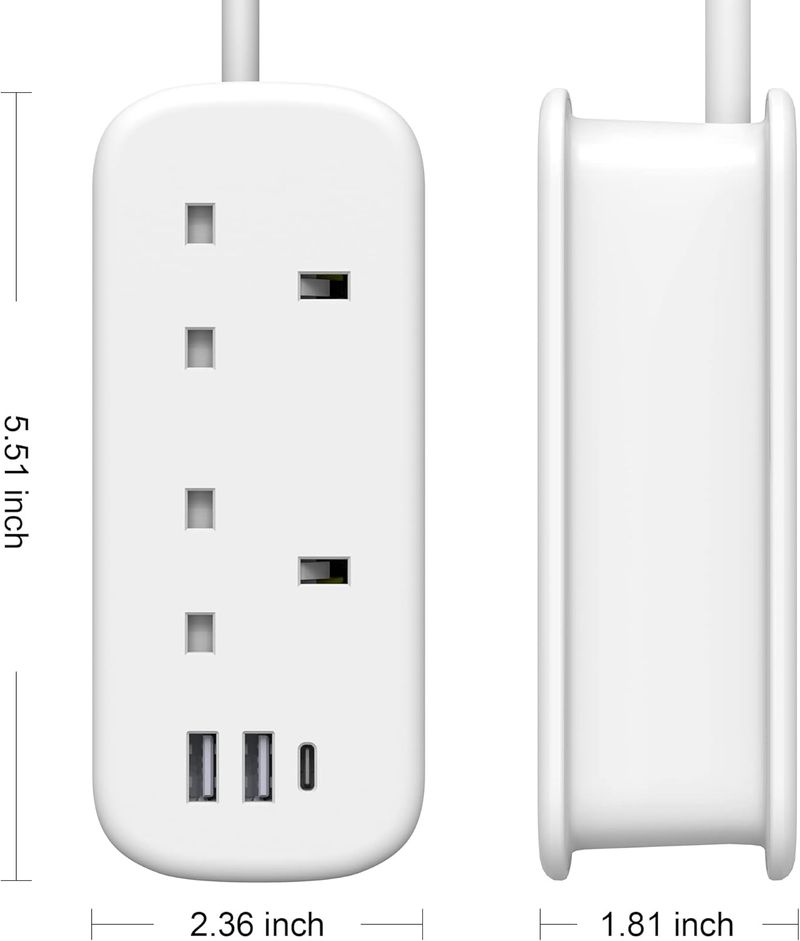 Ultra-Compact 5-in-1 Extension Lead - Power up to 5 devices at once with this portable extension lead. Includes 2 AC sockets, 2 USB-A ports, and 1 USB-C port for phones, tablets, cameras, and more. At just 14 × 5.8 × 4.3 cm, it’s small enough to carry in your bag, suitcase, or backpack for travel.