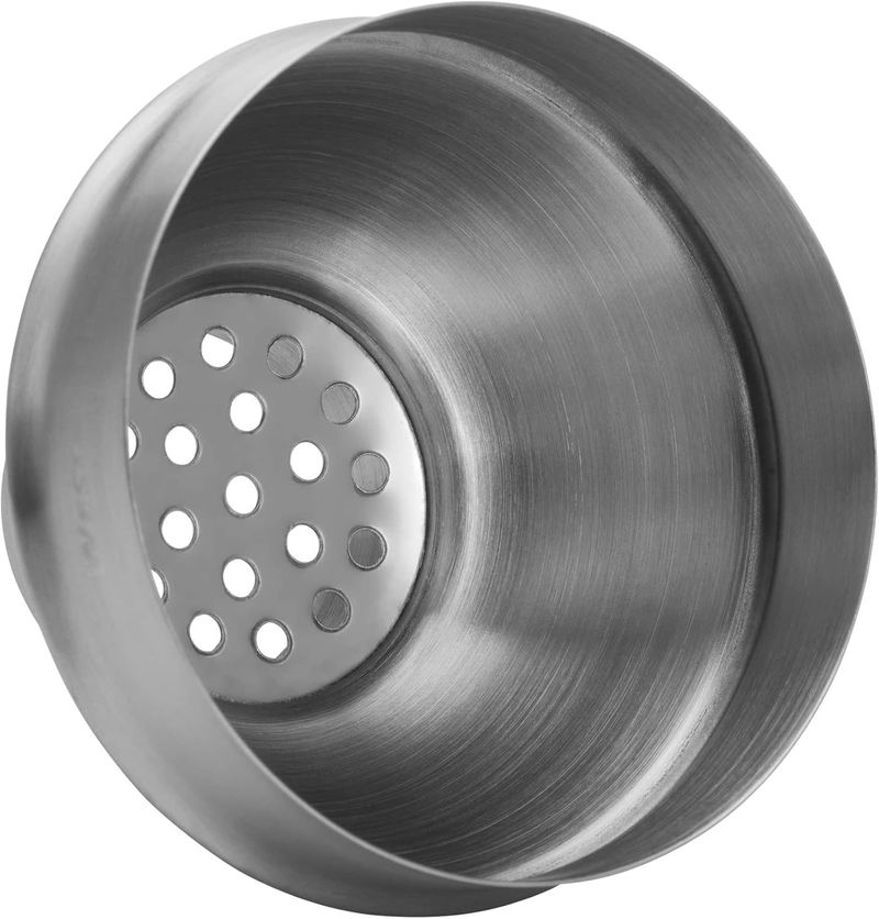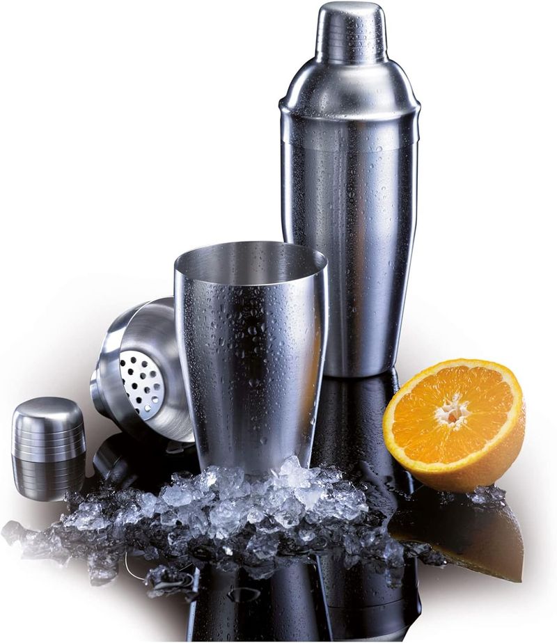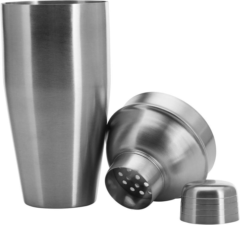 Features built in ice strainer; stainless steel with brushed finish; three parts